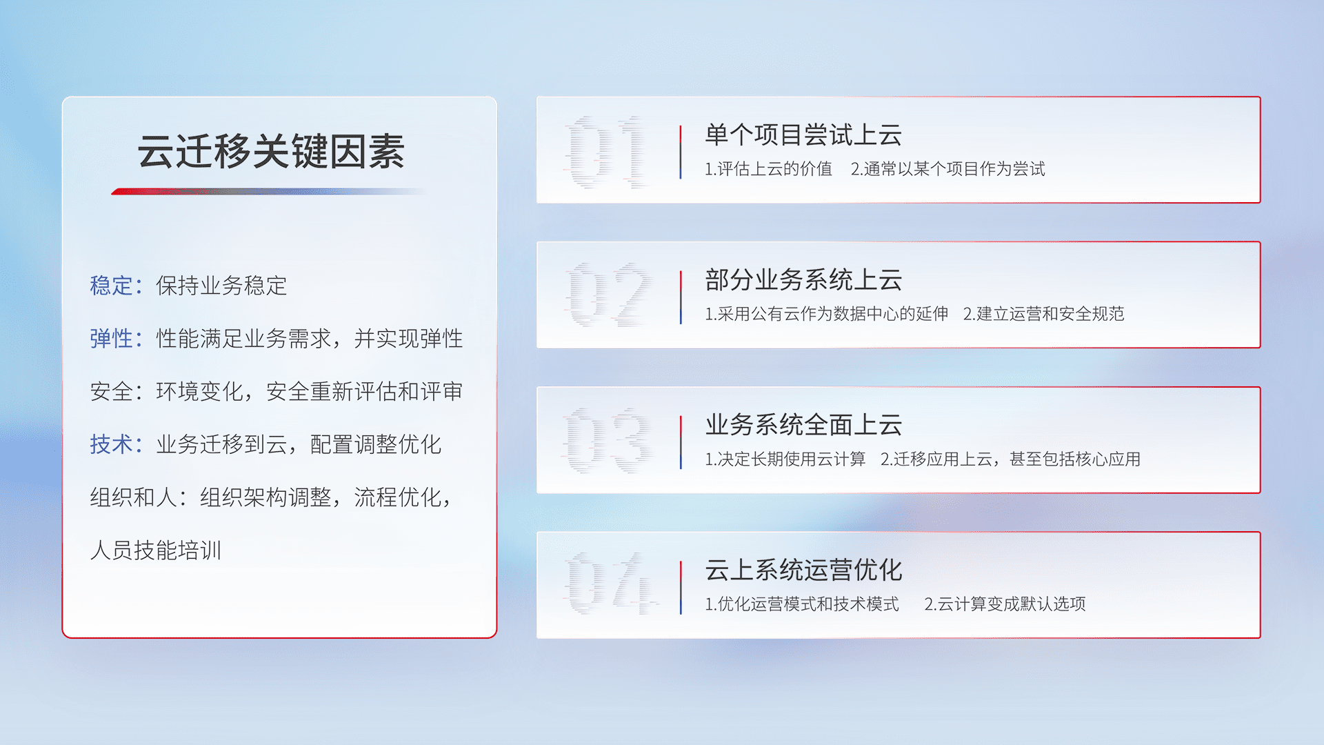 结合实际业务,,,从规划设计、、云平台选型、、、、云原生改造、、数据迁移、、、、集成交付,,,迁移全过程为客户识别最佳上云路径,,做好风险识别管理,,设计网络架构、、、身份权限、、、、安全审计合规、、、操作审计、、、、日志审计、、、、监控告警策略、、、、多站点容灾设计等,,,对云上基础设施进行整体规划,,提升IT治理水平,,,以满足弹性、、、高可用、、、、高性能的需求。。。。